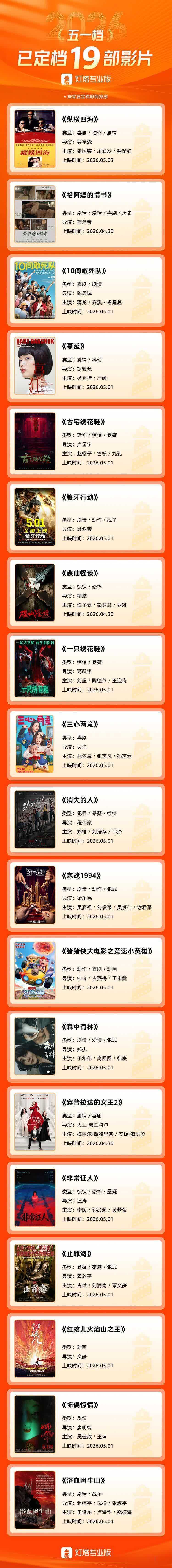据灯塔专业版数据,目前已有19部电影定档今年五一档,除了《纵横四海》,还包括《寒战1994》《森中有林》《10间敢死队》《蔓延》《穿普拉达的女王2》《非常证人》,以及粤产电影《给阿嬷的情书》和《猪猪侠大电影之竞速小英雄》,类型丰富多样,涵盖动作、爱情、喜剧、动画、犯罪、奇幻、悬疑等多种类型影片。