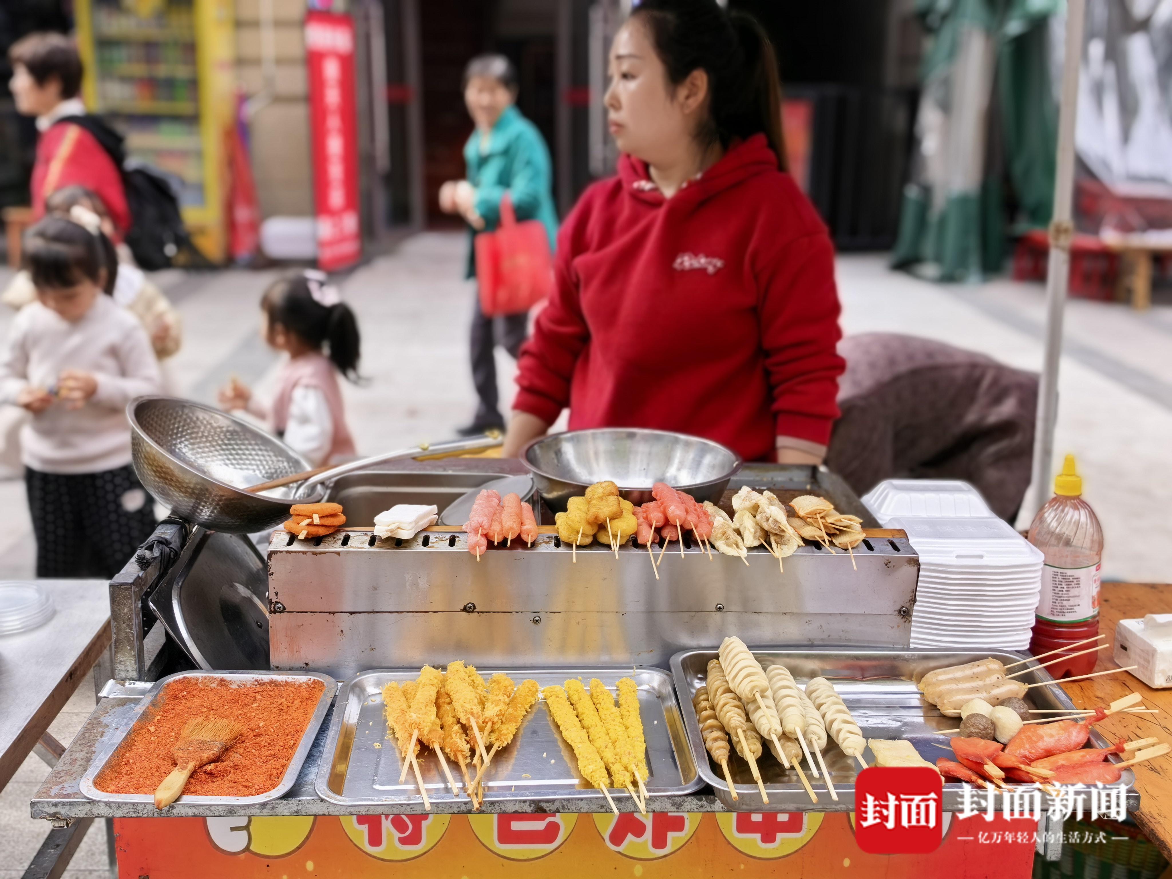 刚出摊的特色炸串小吃摊。