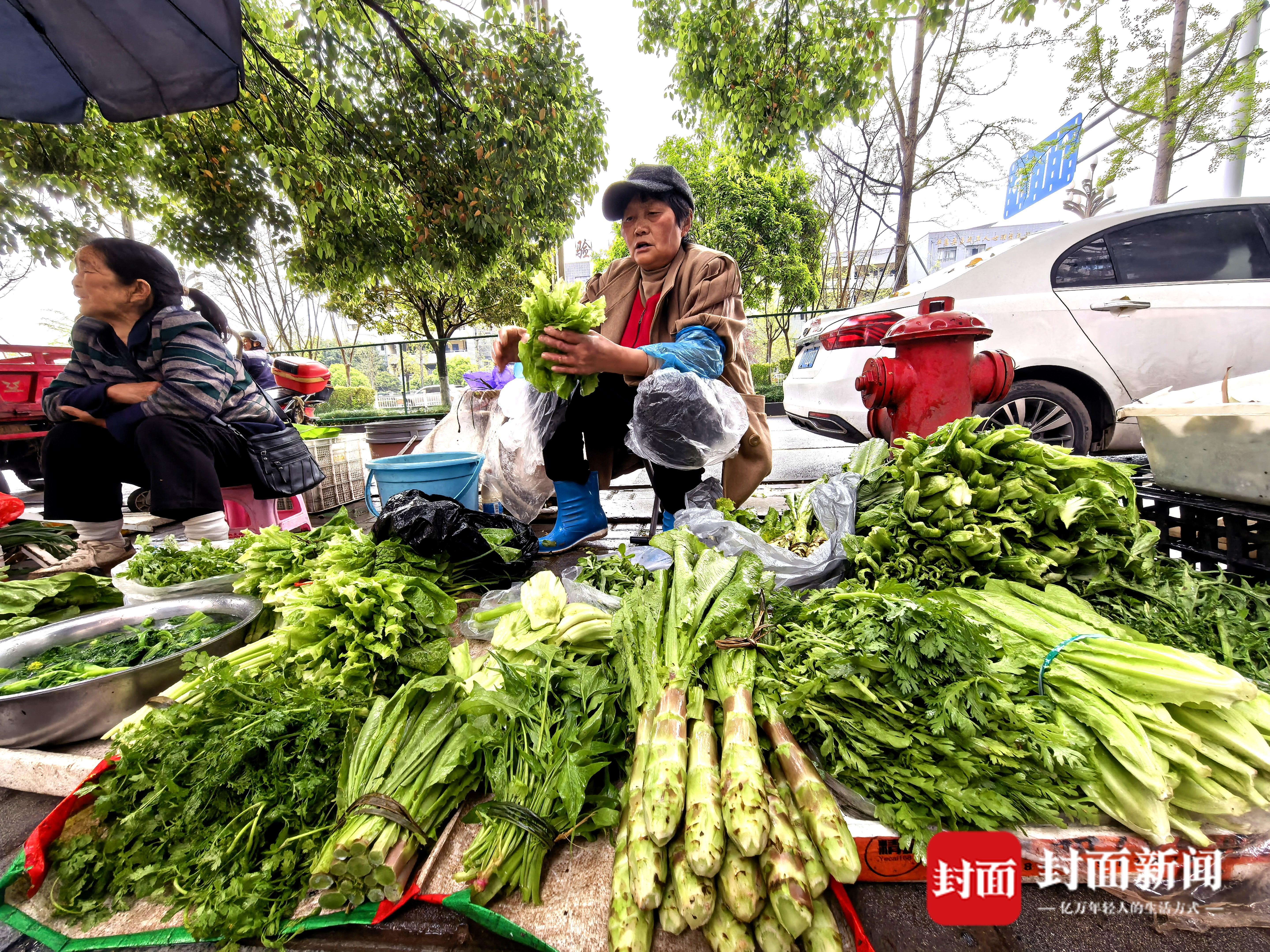 刚从地里采收的蔬菜、瓜果,当地人称为“土货”。清晨,摊贩会背着“土货”,走到小区门口、桥头、路边或广场,背篼往地上一放就开卖。而那些从批发市场流转来的“车货”,则为了抢占客源,习惯在交通要道聚集。